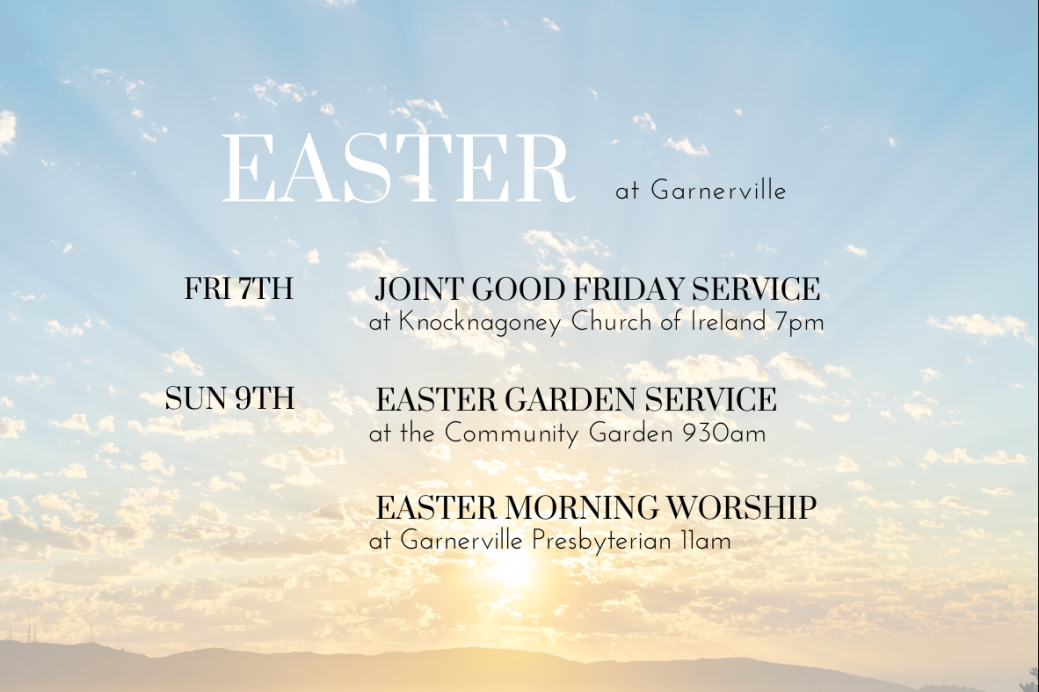 Our Community Garden service will be on Easter Sunday (9th April) at 9:30a.m., joining with Knocknagoney Church of Ireland, Glenmachan Church of God, and local residents to celebrate the central part of the Easter story - the empty tomb - which of course was in a garden!